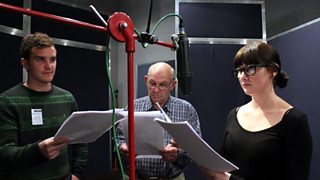 John Ogwen, Sion Ifan a Lowri Gwynne yn recordio yn stiwdio ddrama Llandaf ar 04/10/12.