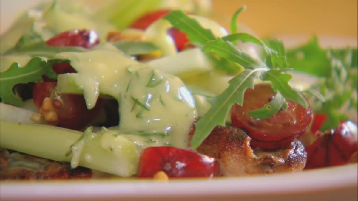 Jason Atherton uses gooseberries in his Waldorf salad for a great British twist. The perfect accompaniment for this sensational cured mackerel.