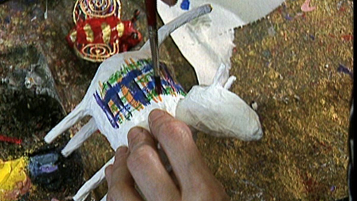 The simplicity of the childlike forms, colours and patterns are appealing features about Julie Arkell's sculptures. Flat sketchbook pages are a repository for exploratory ideas and designs leading to 3D sculptures. Her quirky monologue is endearing. Arkell shows she gets ideas from collecting everyday items which provide the materials for further papier mâché maquettes using tools that are common in the classroom.
