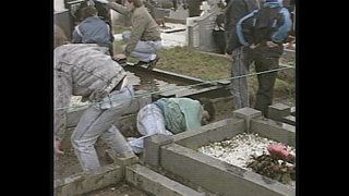 Terrified mourners hide from a loyalist gunman who attacked funerals in Milltown Cemetery.
