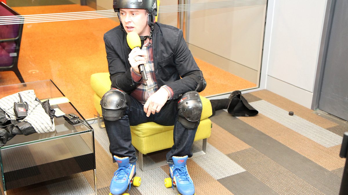 Scott Mills, blindfolded & roller skating towards 3 celebrities for a Comic Relief Kiss.