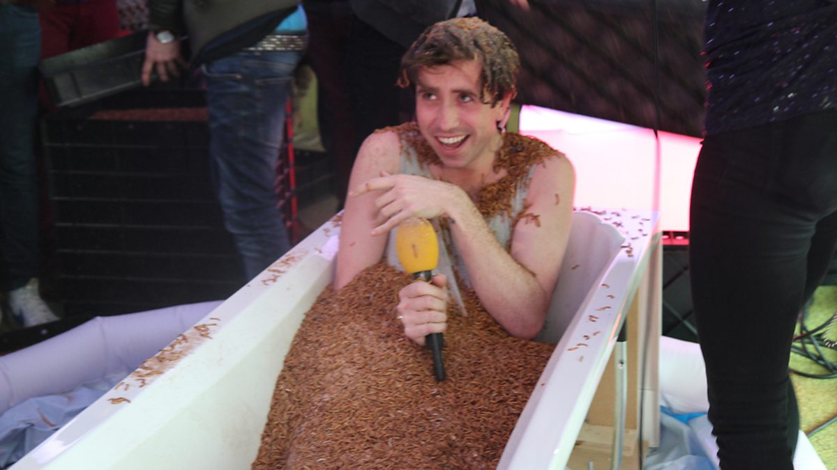 Grimmy gets smothered from hair to toe in Meal Worms for Comic Relief.