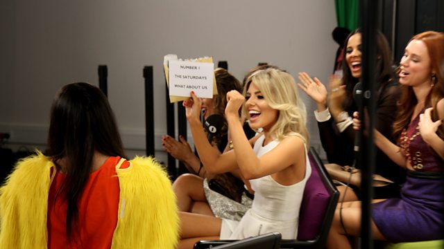 Jameela (complete with chicken suit) and The Saturdays sing along with hairbrushes to their No. 1 single What About Us live on the mayhem filled Official Chart.