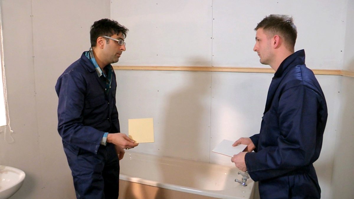 To decorate his friend's bathroom, Sanjeev Kohli enlists the help of a professional tiler, Steven Lang. They work out how many tiles they need before carrying out the job. They also need the right amount of paint to complete the colourful makeover.