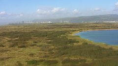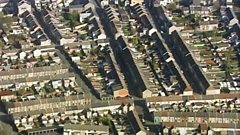 Aerial views over Tredegar in the south Wales valleys demonstrating a linear settlement pattern in the south Wales valleys that is a result of local topographical features.