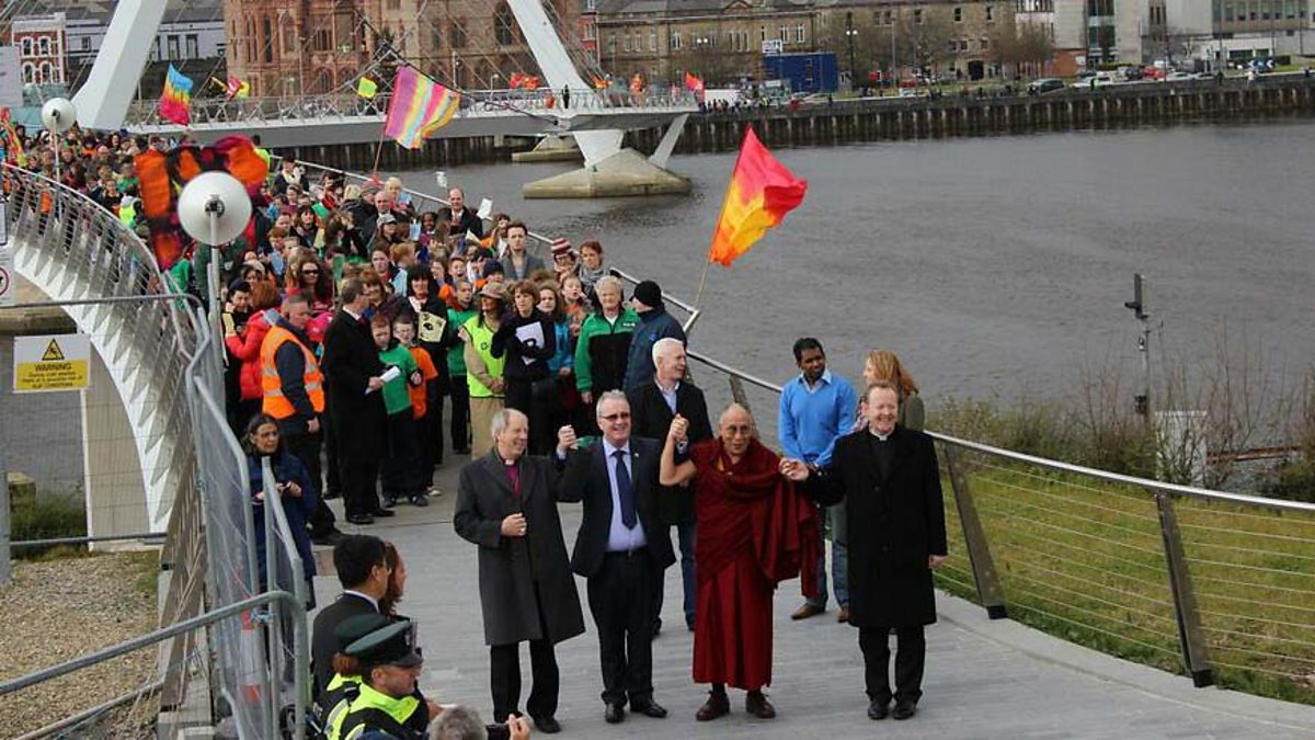 Dalai Lama meets schoolchildren in Derry. Caitheann an Dalai Lama seal le daltaí scoile i nDoire Cholmcille.