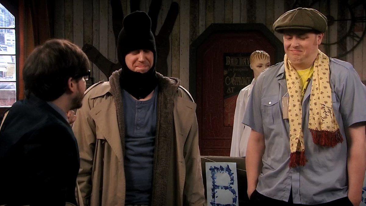 Tom and Ben have transformed the flat in to a bank as they rehearse a robbery scene for a new film project. Matthew meanwhile is the unsuspecting victim.