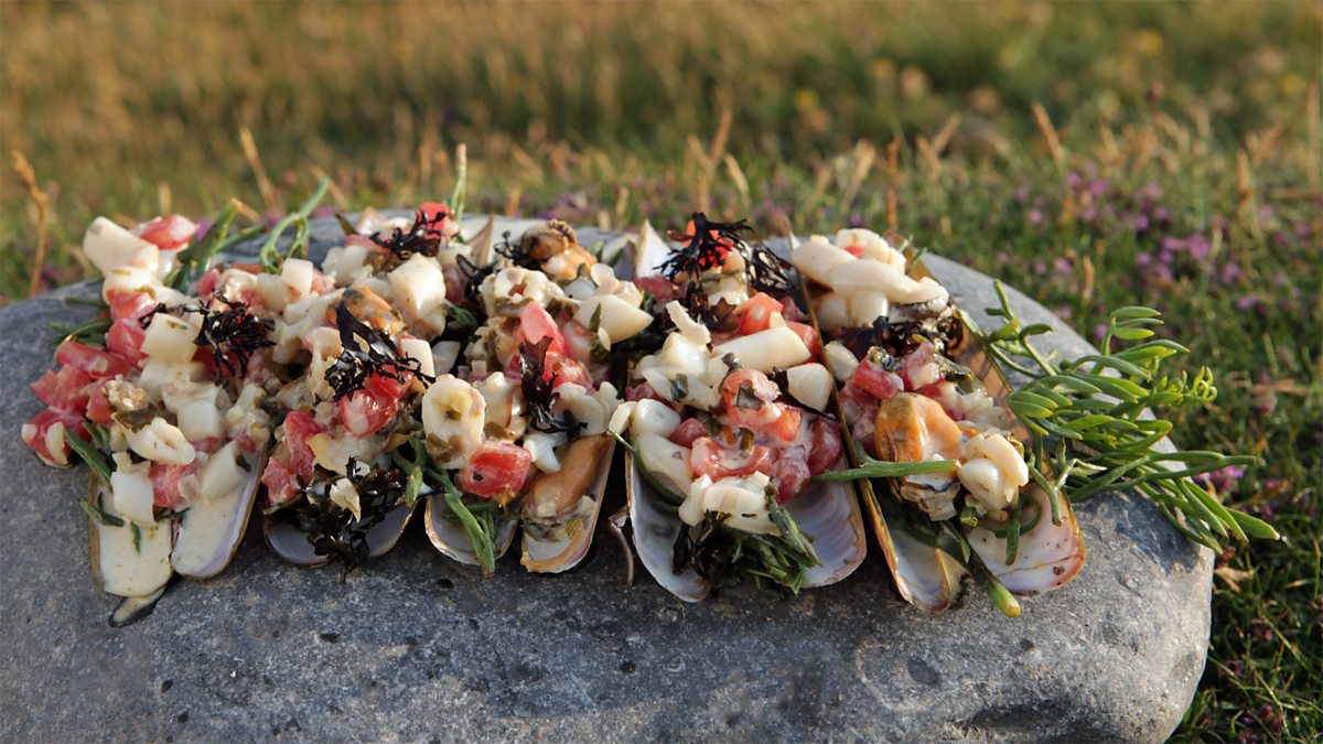 Clams and mussels are served in a creamy sauce topped with seaweed - one to try after a seaside foraging trip