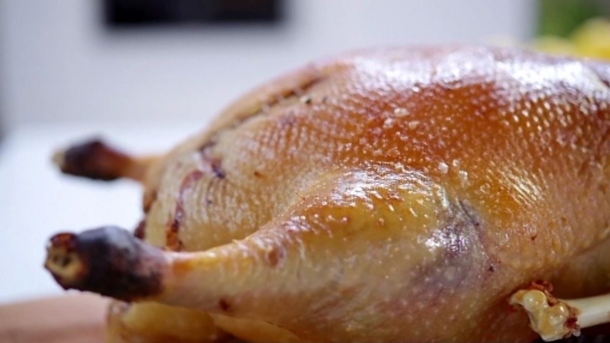 Roast goose with festive rice stuffing and roast potatoes
