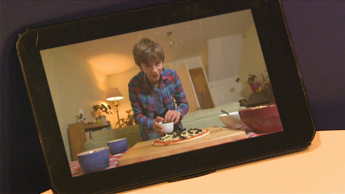 Ben is keen to improve his French and links up online with friends who are in a supermarket in Marseille. We follow Ingrid, Lili, Thibaud and Ulysse as they wander round selecting ingredients for pizzas. The girls choose traditional pizza ingredients – des champignons, des oignons, des œufs, du fromage, du saucisson. However, Thibaud and Ulysse are putting some unusual pizza ingredients in their basket – des bananes, du chocolat, des bonbons, de la Chantilly. We meet them later on in the kitchen as they prepare their pizzas. Ben looks on with great interest and takes the opportunity to practise his food vocabulary. He is making his own pizza in his kitchen in the UK. Everyone enjoys their pizzas once they are cooked although Ben has put too many chilies on his and needs a drink to cool down.