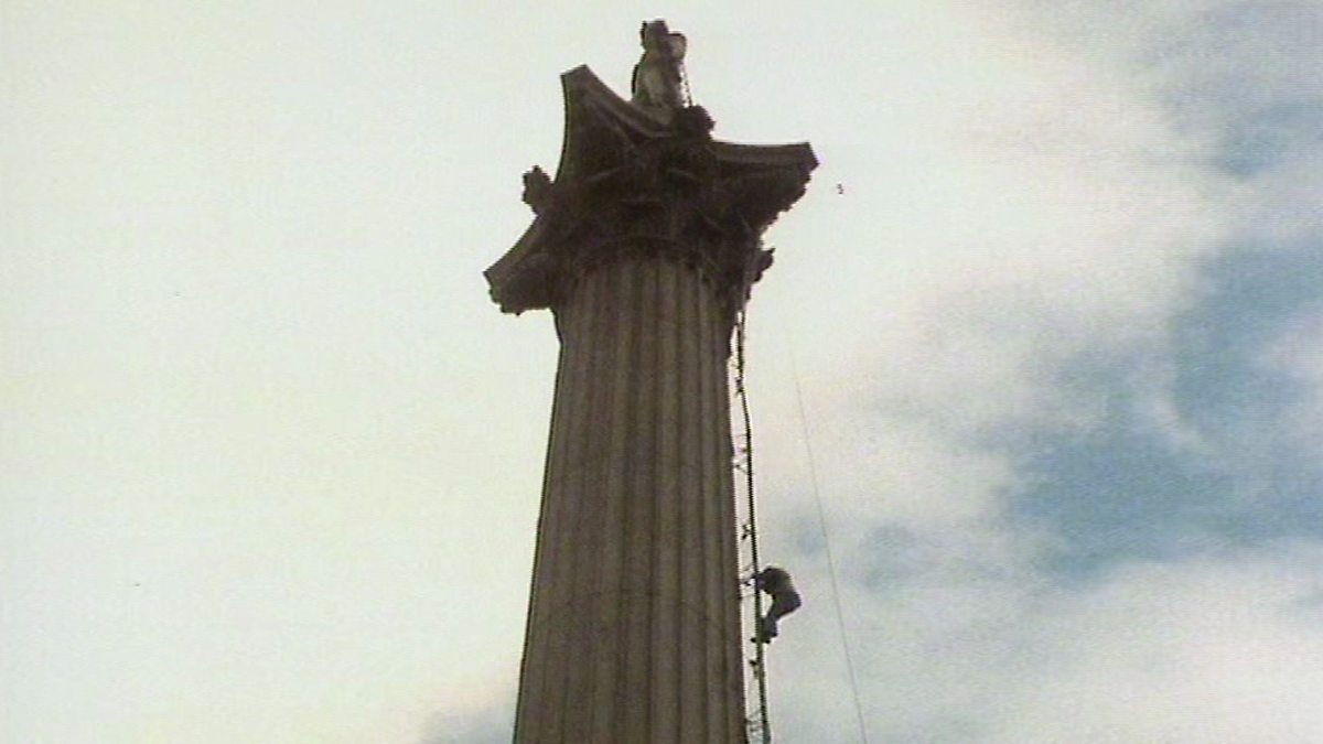 70's John Noakes climbs up Nelson’s Column on a rickety ladder to clean off pigeon poo.
