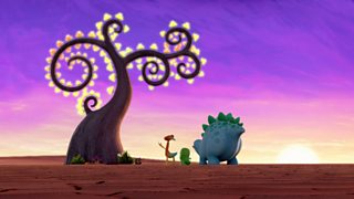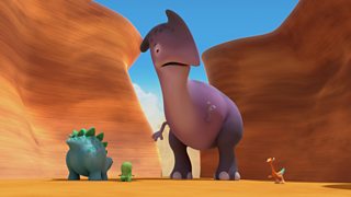 The dinopaws want to play in a wiggly canyon, but their path is blocked by a huge dino.