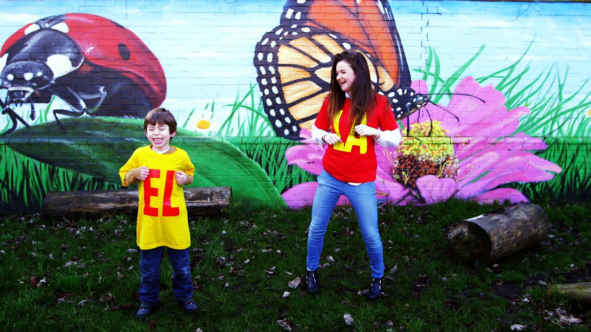 A song in English and Spanish explaining that all nouns in Spanish have gender and are either masculine or feminine. It uses body parts to explain that masculine words use ‘el’ for the, and feminine words use ‘la’. It also shows that the gender of the person doesn’t matter. Nouns ending in o are usually masculine (el) and nouns ending in a are normally feminine (la) although there are exceptions like la mano (the hand) The screen background is red with yellow writing for feminine words and the screen is yellow with red writing for masculine words, matching the T-shirts worn by the children.