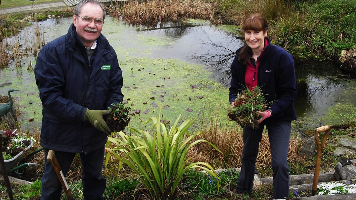 Carole and George are preparing for the pond bank revamp by removing all the plants. By doing so they are demonstrating how to lift and split herbaceous perennials.