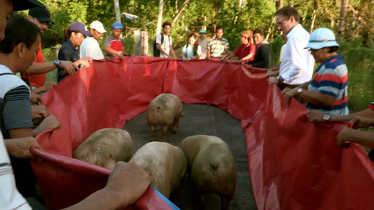 A team of disaster vets show Michael how to move pigs during a typhoon. He watches the technique, which moves the pigs’ pen along with them, and keeps them calm under stress.