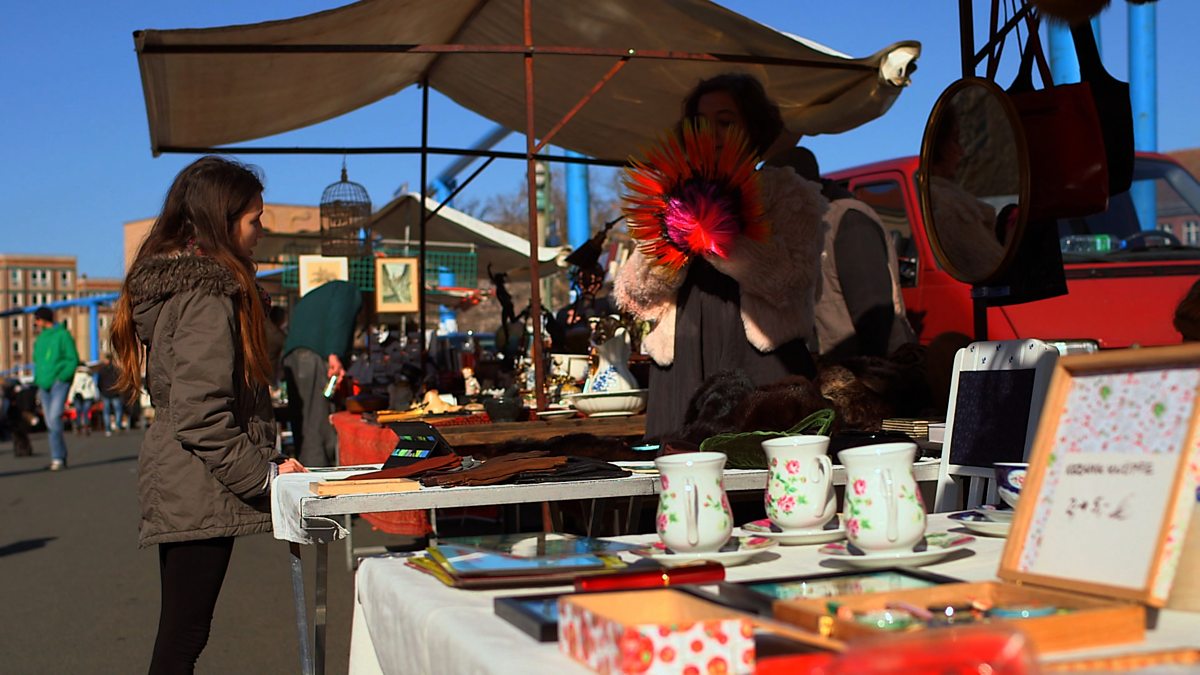 Charlie is learning German at school. He is keen to improve and practise his German and links up regularly with friends in Berlin for regular chats. Today he links up online with Lena in Berlin who is choosing clothes for a party. She can’t decide what to wear and asks Charlie for advice. Lena feels she has nothing to wear. None of her clothes are right – they are either too long or too short or too green! Lena wants to have some new clothes for the party. She goes to a local flea market and sees just the thing. A very colourful and original wig. Both Charlie and Lena agree that the wig will be great for the party. It costs 5 euros, which is more than Lena has to spend. With Charlie’s help, she bargains with the stallholder and beats the price down. Charlie is able to use his knowledge of numbers to help Lena with the transaction.