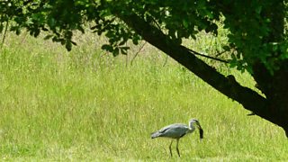 Creyr Glas â Thwrch Daear yn ei geg.
