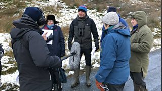 Criw Galwad Cynnar ar y Migneint yn yr eira.