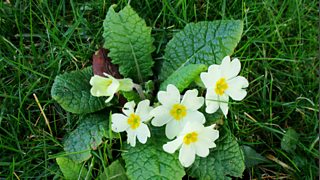 Briallu gwyllt yn tyfu ar dir hen eglwys Sant Cyndeyrn, Llanelwy - Tudur Aled Davies.