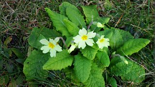Briallu gwyllt yn tyfu ar dir hen eglwys Sant Cyndeyrn, Llanelwy - Tudur Aled Davies.