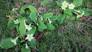 Briallu gwyllt yn tyfu ar dir hen eglwys Sant Cyndeyrn, Llanelwy - Tudur Aled Davies.