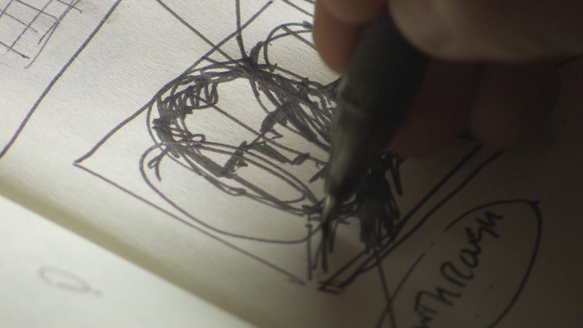 View of faces in the street are compared with Nick’s portraits as he explains his portraits are quite like androids as they are angular. He jots down ideas in his moleskin sketchbook in pen followed by projected images of his notes and drawings.