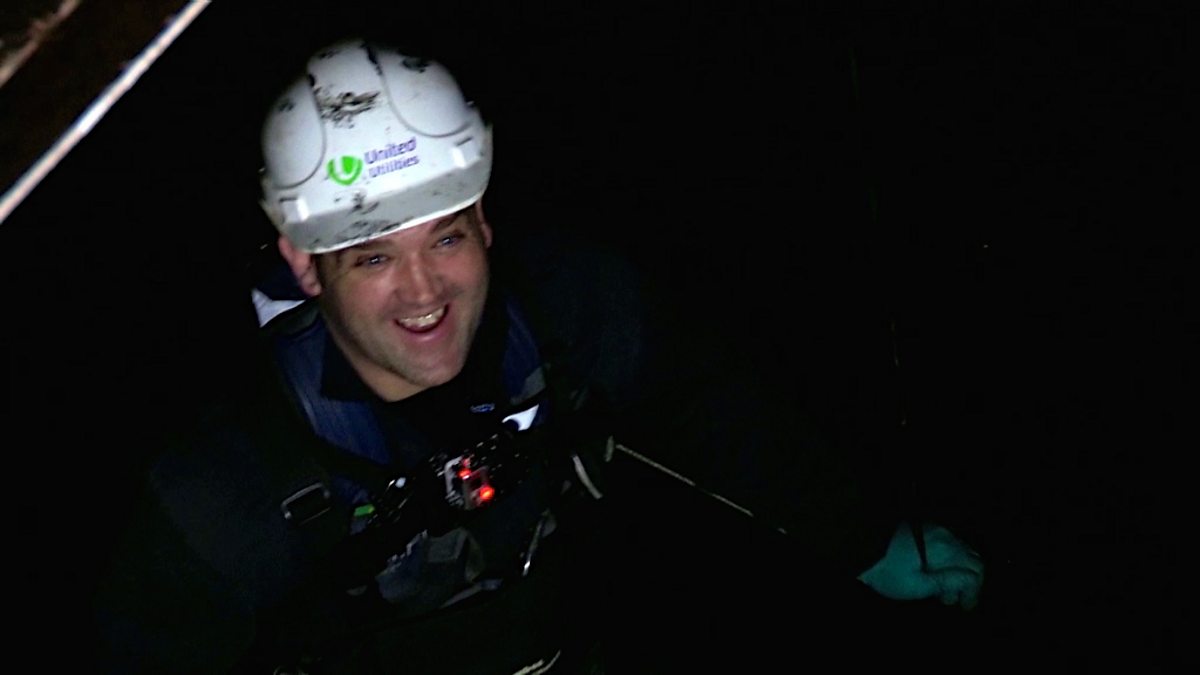 'You have to be crackers to do this.': Chris is lowered into the depths to clear waste.
