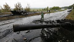 (Photo: Ukrainian troops walk near destroyed military vehicles outside Slaviansk, eastern Ukraine. Credit: Reuters)