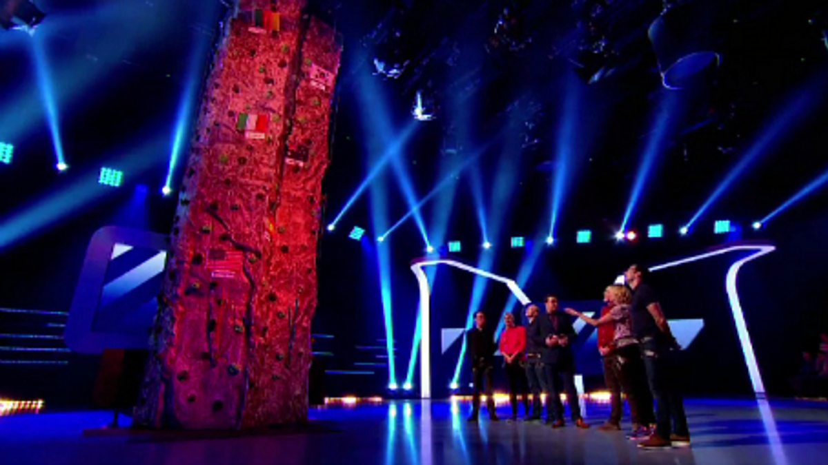 The teams scale a giant climbing wall in the studio.