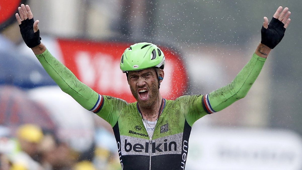 Belkin rider Lars Boom pulled away to win the Tour de France's fifth stage from Ypres to Arenberg Porte du Hainaut in wet conditions.
