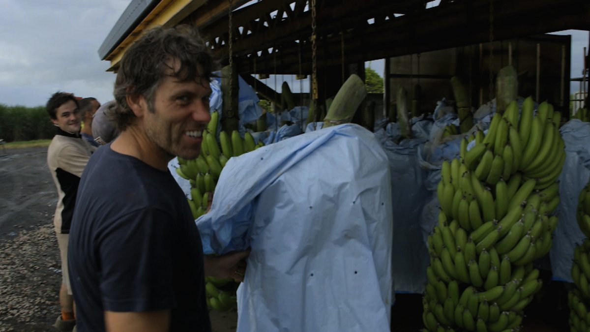 John Bishop picks bananas with backpackers and is surprised by a lurking snake.