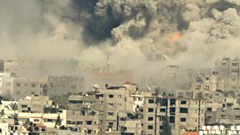Photo: Plumes of thick smoke rise from bombed buildings in Gaza: Credit: Reuters)