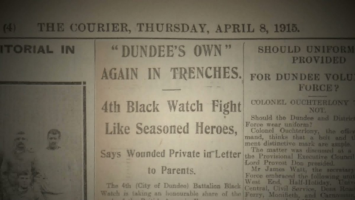 The Fourth territorial Battalion of the Black Watch were known as ‘Dundee’s Own’, and came to symbolise the terrible sacrifice made by the city. Accounts of their first months in the trenches of the Western Front were printed in Dundee’s three newspapers, providing a vital source of information for thousands of anxious family members at home.