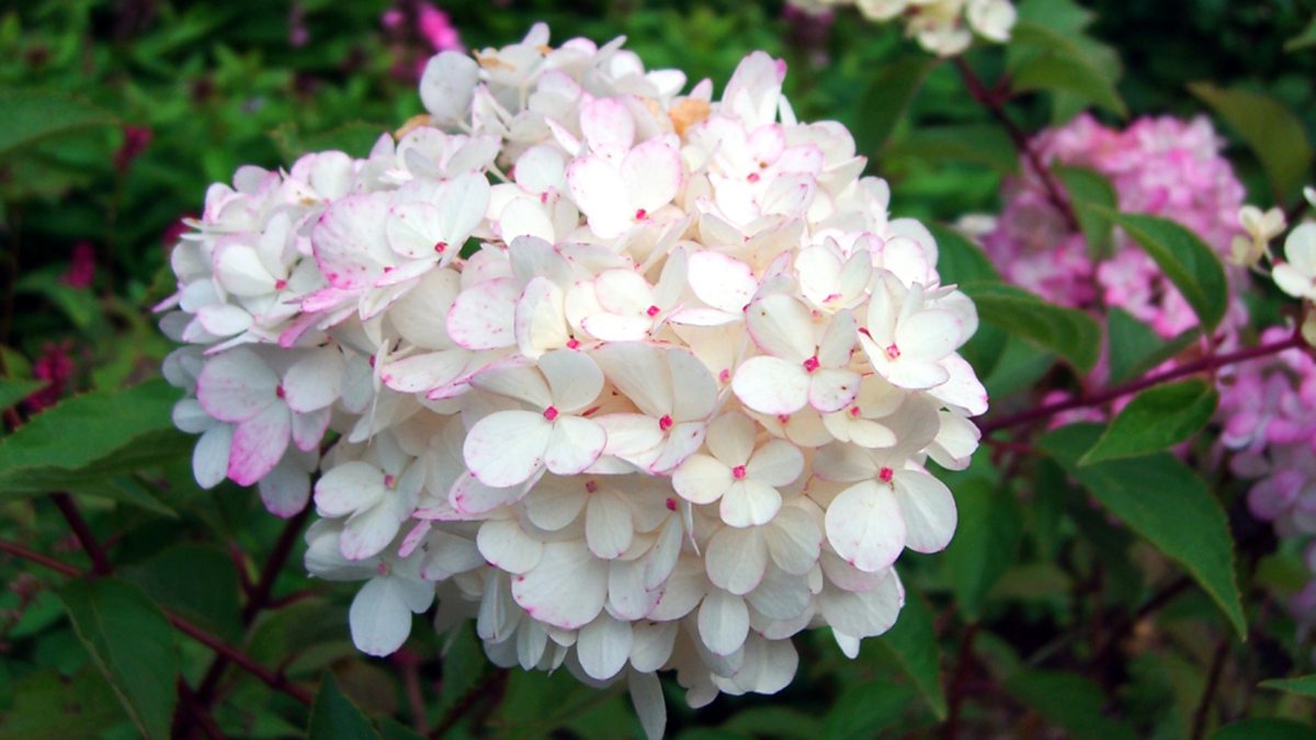Carole plants Armeria into a stone dyke and Jim is impressed with the colour of a Hydrangea