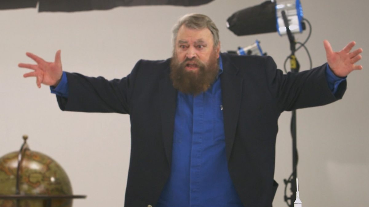 An enthusiastic Brian fires his gun on the set of Flash Gordon.