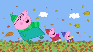 Mae'n ddiwrnod oer a gwyntog felly mae Peppa, George, Mami Mochyn a Dadi Mochyn yn gwis...