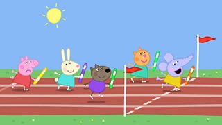 Heddiw ydy diwrnod mabolgampau ysgol feithrin Peppa ac mae llawer o ddigwyddiadau arben...