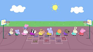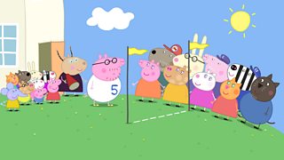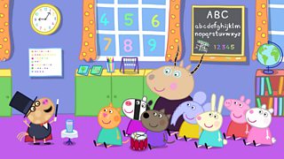 Mae Peppa a'i ffrindiau yn dysgu sut i gyfrif wrth chwarae gemau yn yr ysgol feithrin e...
