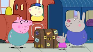 Mae Musus Hirgorn yn mynd â Peppa a'i ffrindiau ar daith trên. Mrs Hirgorn takes Peppa ...