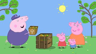 Mae Peppa a George yn mynd â bin yn llawn sbarion llysiau i domen wrtaith Taid Mochyn. ...