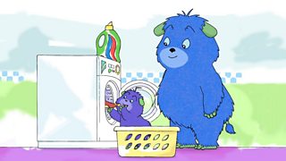 Mae Wmff yn rhoi help llaw i'w fam i hongian y dillad gwlyb. Wmff helps his mum to hang...