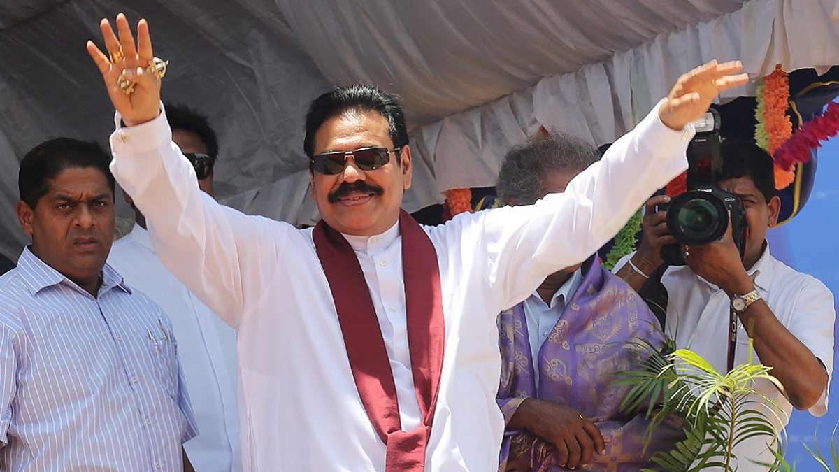 Photo: Sri Lankan President Mahinda Rajapaksa waves to supporters at an election rally at the former rebel capital of Kilinochchi, on September 14, 2013. (Buddhika Weerasinghe/Getty Images)