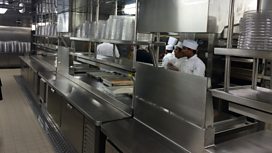 Neil Sackley chats to a chef inside one of Britannia's huge gallies