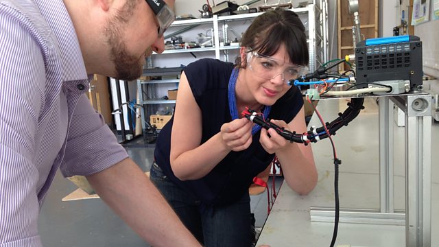Shows the development of new robotics, away from skeletal based stiff limbs, to robots that have soft limbs. Pneumatics enables them to grip more accurately to be able to travel over rough terrain and to withstand any forceful impacts. The link between nature and the research is explained with examples from worms, elephant’s trunk and octopus’ tentacle. An easy-to-build simulation of the soft robotic arm is demonstrated to guide students in their own experiments. The soft robot is shown in action working across different terrains and with different objects. The safety implication of using a lightweight object is presented.