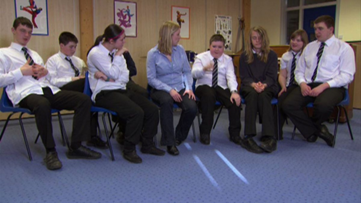 We see Rebecca Applin, a musical theatre composer, explaining how the lyrics for the musical I Know Me were created with the young people who performed in it. We see her leading a workshop with a group of school children. Together, they create lyric lines for the middle section of the song So Angry, after talking about the things that personally make them feel angry. Students are encouraged to sing the musical phrase they’re creating the lyrics for, and share the things that make them feel angry. On-screen captions show how series of words are broken into syllables to fit the notes of the phrase from the song. Students are encouraged to fit their lyric ideas to a backing track of So Angry.
