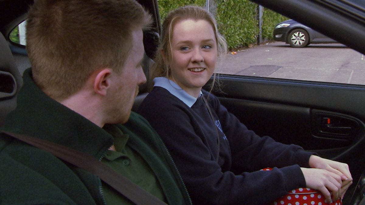 Mae Courtney ar ben ei digon pan ddaw Rhys i'w chasglu o'r ysgol. Courtney is thrilled when Rhys comes to collect her from school.