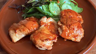 Tea smoked brined chicken thighs with Peri Peri and cucumber salad