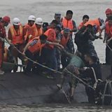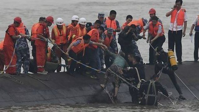 (Photo: Emergency workers pull survivors out of the Yangtze River. Credit: AP)