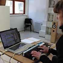 Sara Mohr-Pietsch visits the East London studio of sound artist and electronic composer Kaffe Matthews. Kaffe shows Sara the bikes she uses for her bicycle operas, demonstrates the cube of speakers where she plays with sharks, and talks about the creative process in her constantly changing workspace.