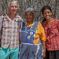 (Picture: Linguists stand either side of one of the only three people to speak N|uu. Credit: Paul Weinberg)